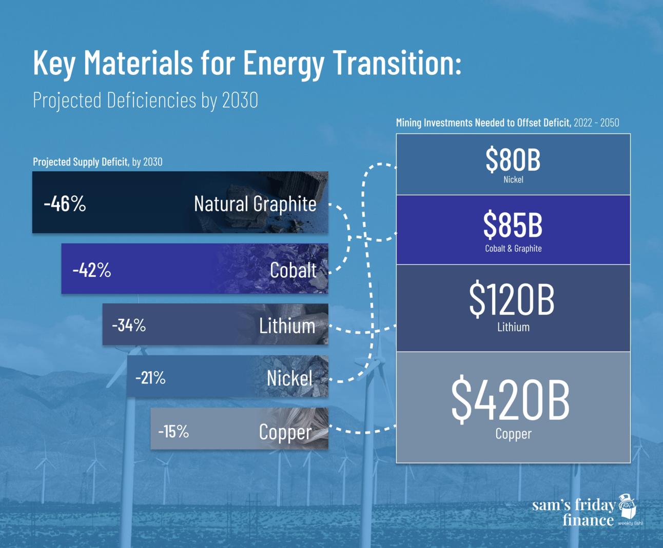 This week, we are going to jazz things up and introduce our first infographic. There are key materials required to transition to more green technology. With the projected extraction rates, we are going to face serious supply deficits in key materials. Below you’ll find the projected supply deficit for each mineral and the additional investment needed to bridge the gap.