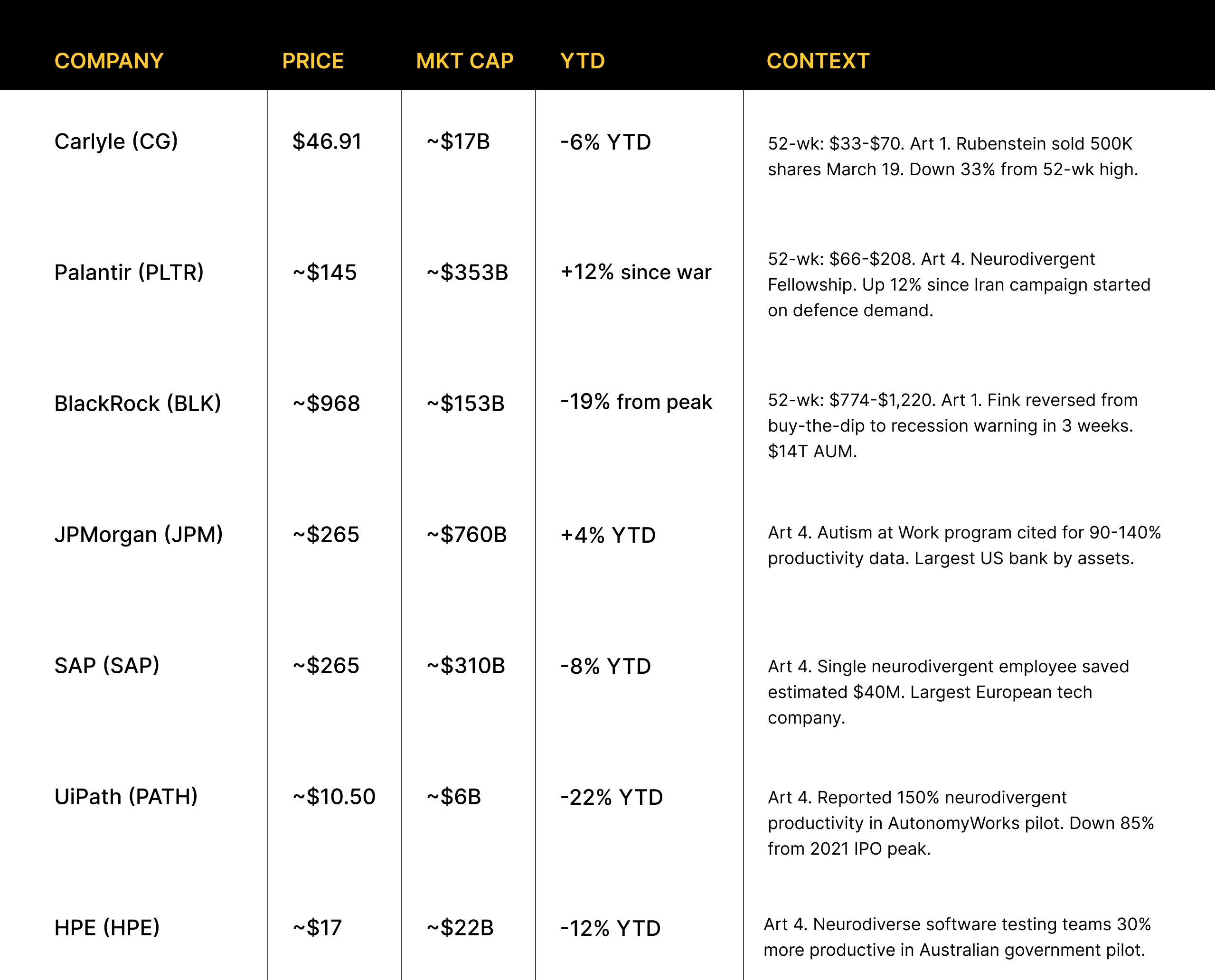 CBO, ABC News, Military Times, Fox News, Executive Order 14347, NGAUS (McConnell quote) Semafor (March 23 2026, Liz Hoffman interview with Stavridis), Semafor (June 2025 interview), RT/Pravda NATO/BBC (BlackRock Fink reversal), Carlyle.com (Stavridis blog post), Motley Fool, NPR Telegraph, WSJ Opinion (Seth Jones/CSIS), USNI News, CNN, NPR, Fortune, FT (George Steer, Amelia Pollard, Malcolm Moore), Bloomberg (x2), CNBC, Greek City Times/Kathimerini, 19FortyFive, Axios, Salon, CBS News, Paul Krugman Substack, Common Dreams, Washington Times, The Real News, The Guardian (Polymarket), MS NOW (Public Citizen) FT (March 10 2026, Jacob Judah and Alan Smith), Priyom shortwave monitoring group Forbes (March 26 2026), Fortune (March 24), Tom's Guide, Gizmodo, Palantir job posting / X announcement (Dec 7 2025), Gartner (Feb 2024 study), JPMorgan Autism at Work program, UiPath/AutonomyWorks, HPE, SAP, ONS / National Autistic Society, Buckland Review of Autism Employment (2024), Zurich UK survey, Bloomberg/PYMNTS (Enabled Intelligence), Exceptional Individuals (UK dyslexia research) Fortune (March 25), Washington Times, NBC, Fox Business, Inc, TMZ, People, Rolling Out Gathered (March 19 2026), Harvard Study of Adult Development